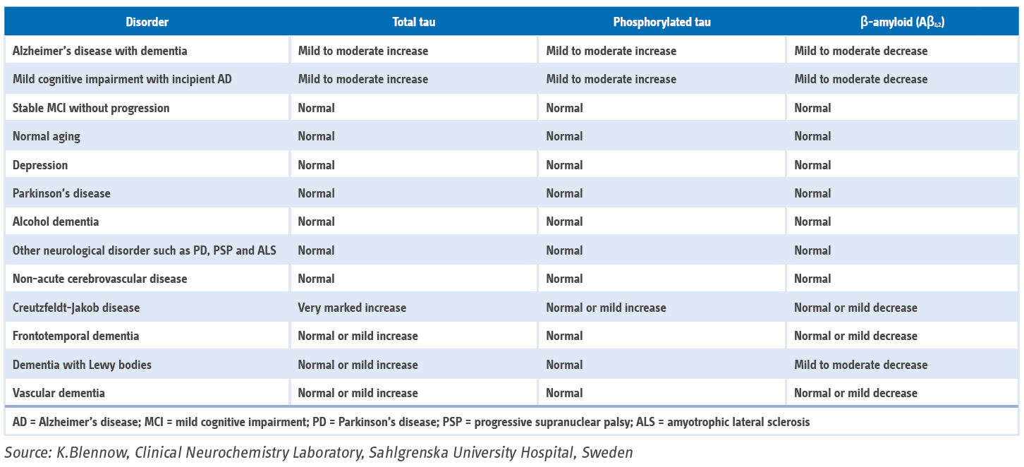 The detection of CSF PrPSc is performed only in reference laboratories for prion diseases with the nonspecific 14-3-3 protein. For now, only results of CSF Aβ42 (or CSF Aβ42/40 ratio), T-tau and P-tau can be used in routine clinical setting.
