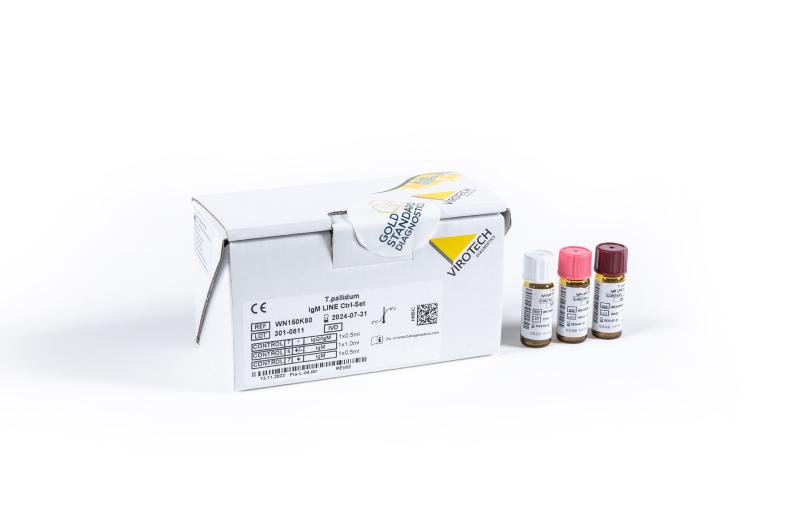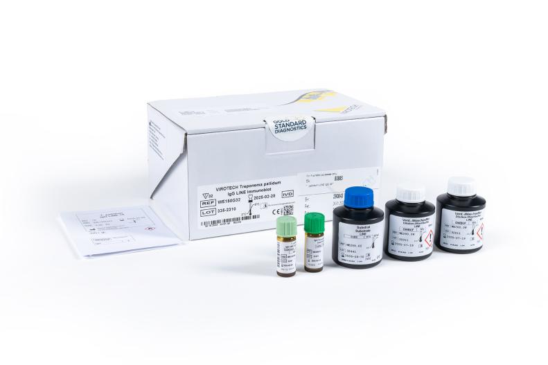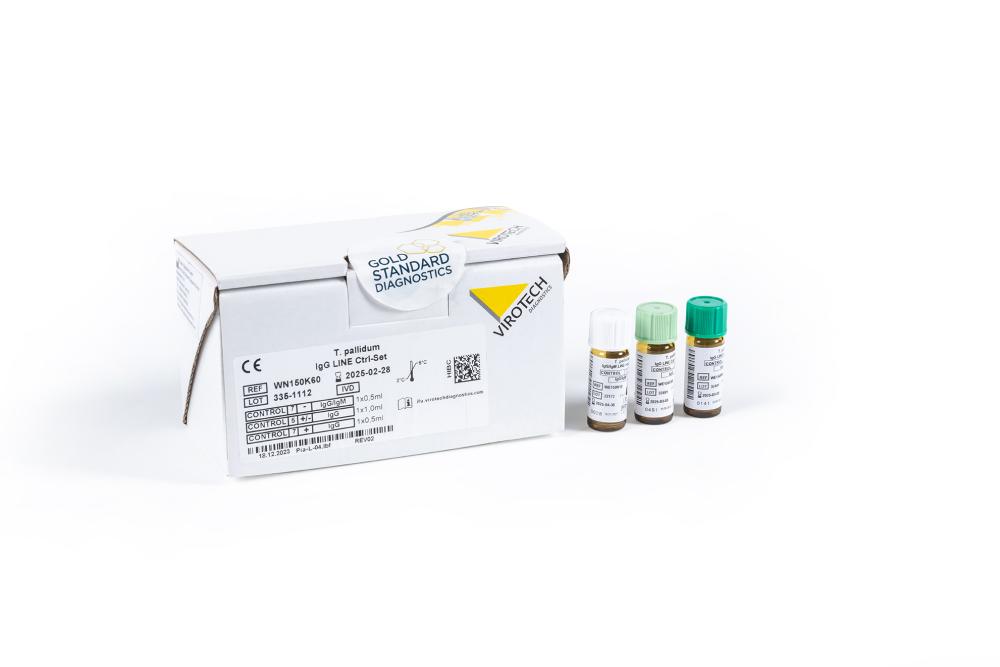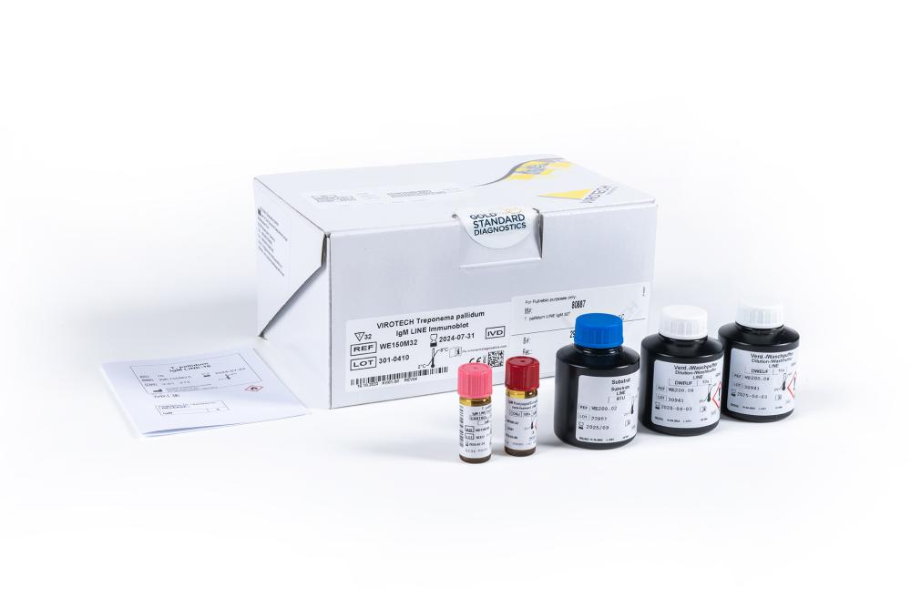Treponema pallidum LINE Immunoblot assay is for in vitro diagnostic (IVD) use for the qualitative detection of Treponema pallidum specific IgG-/IgM-antibodies respectively in human serum. The assay can be used as confirmation test for an extended Syphilis diagnosis, in case the result of the screening test is doubtful (suspicious) or positive.